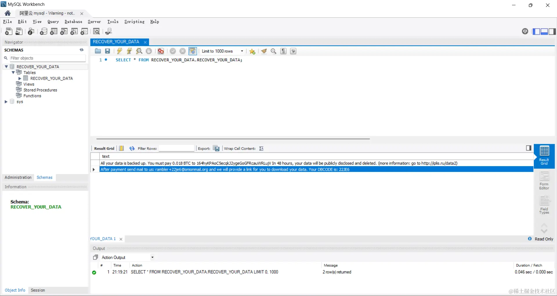 'All your data is backed up. You must pay 0.018 BTC to 164hyKPAoC5ecqkJ2ygeGoGFRcauWRLujV In 48 hours, your data will be publicly disclosed and deleted. (more information: go to iplis.ru/data2)' 'After payment send mail to us: rambler+22je6@onionmail.org and we will provide a link for you to download your data. Your DBCODE is: 22JE6'