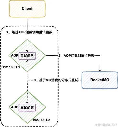 我们引入了@MQRetry注解用于标记业务逻辑函数,一旦该函数发生异常,该注解会将服务名、类的完整名称、方法名称以及实际参数列表发送到消息队列(MQ)中。同时系统会注册一个MQ消费者来消费这些消息,并进行重试处理。