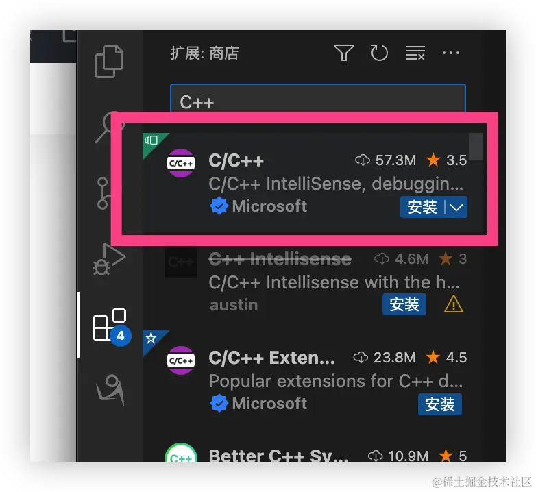 如下图示,点击扩展,然后在商店文本框中输入 C/C++ ,再选择 C/C++ 插件,点击安装。