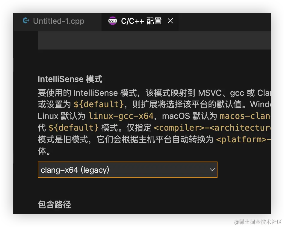 IntelliSense 模式,设置成 clang-x64(legacy)