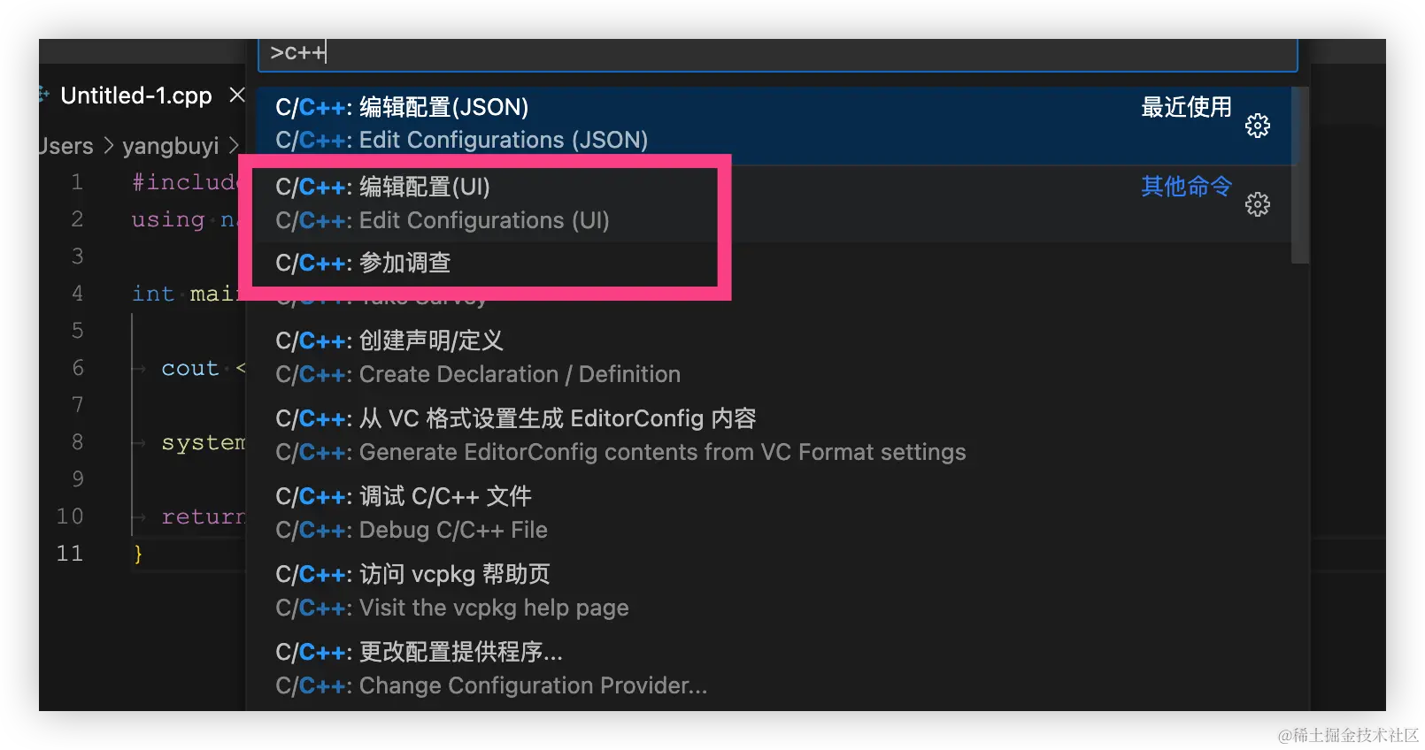 按下 command + shift + P 调出面板,输入C/C++ ,选择编辑配置(UI)