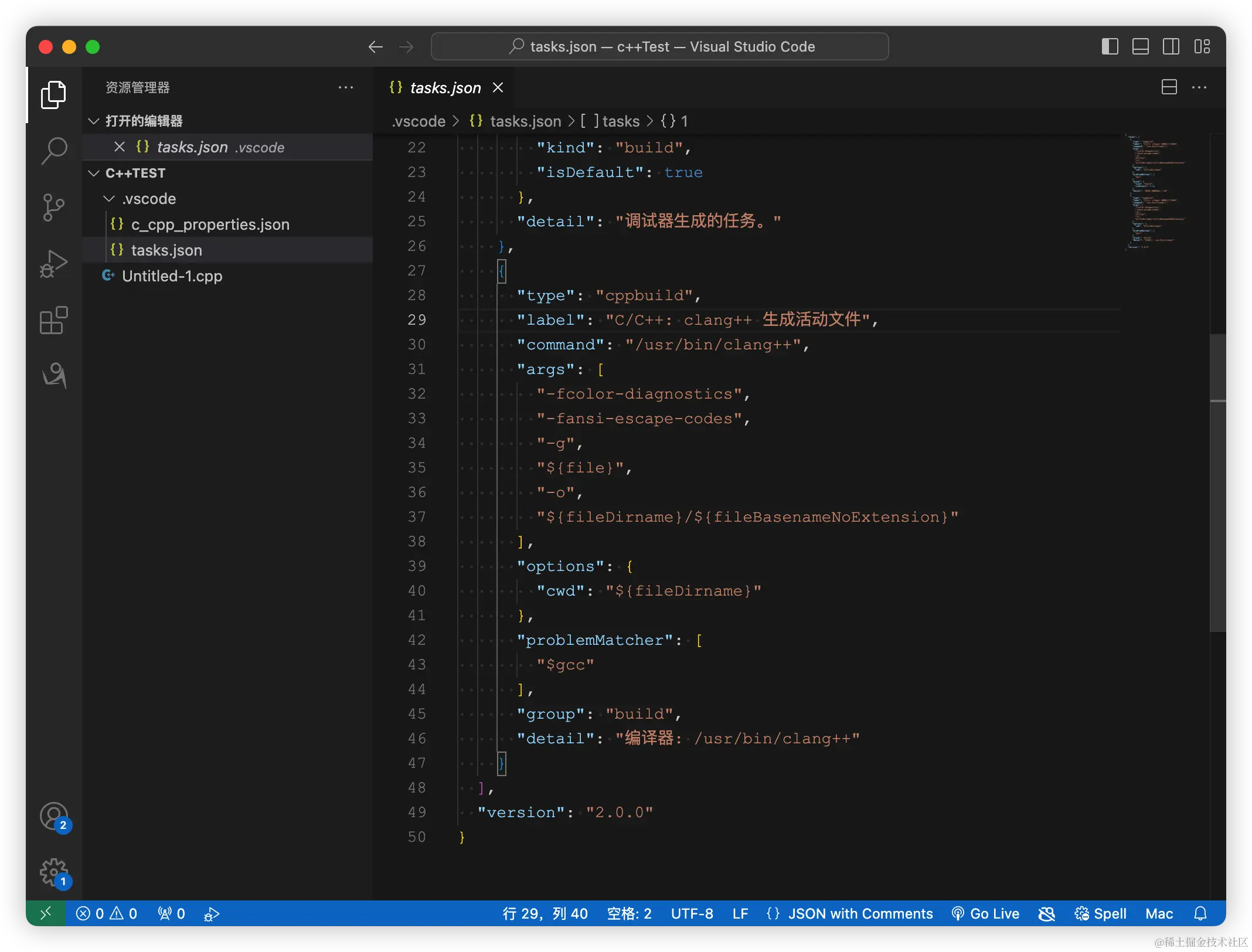 确定完成后,点击齿轮选择 C/C++: clang++ 生成和调试活动文件出现了launch.json 文件