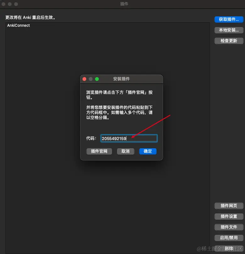 - 在Anki中安装AnkiConnect插件,插件代码2055492159