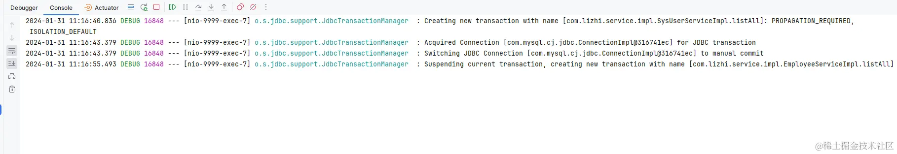 然后我们直接来看我们的传播特性做的事情。其实还是之前 startTransaction() 做的事情。就是开启一个新的事务来做。我们可以看一下这一次的连接是谁的