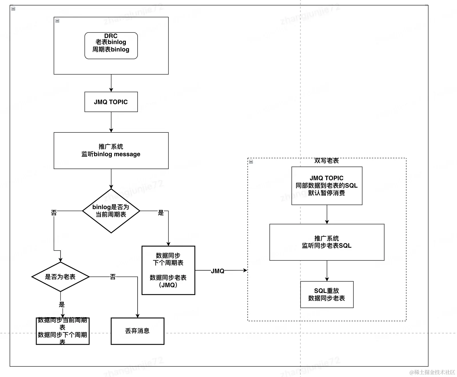 2.监听增量binlog,京东内部有现成的数据订阅中间件DRC,读者也可以使用cannal等开源中间件来代替DRC,原理大同小异,此方案对业务无影响。