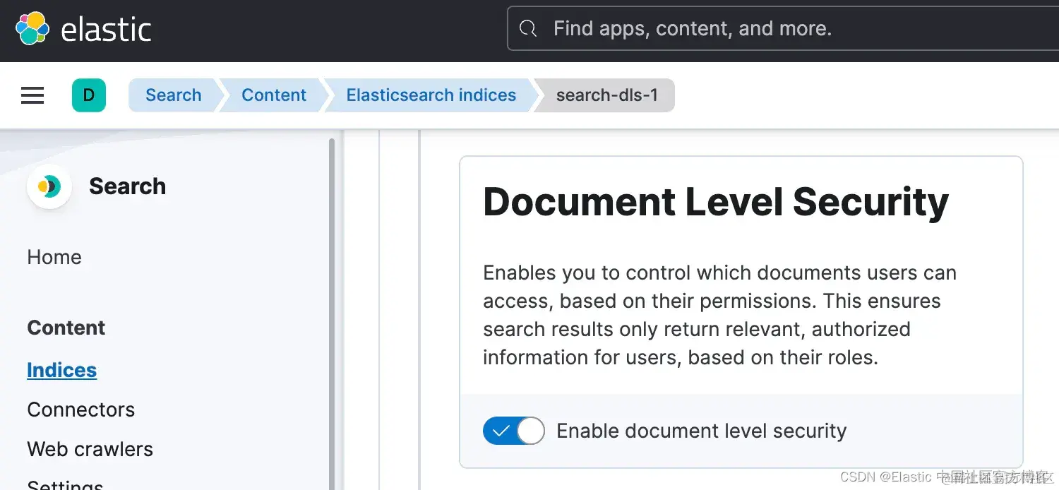 如果你的连接器符合条件,并且你拥有 Platinum+ Elasticsearch 许可证,则可以通过连接器配置页面上的开关启用 DLS。