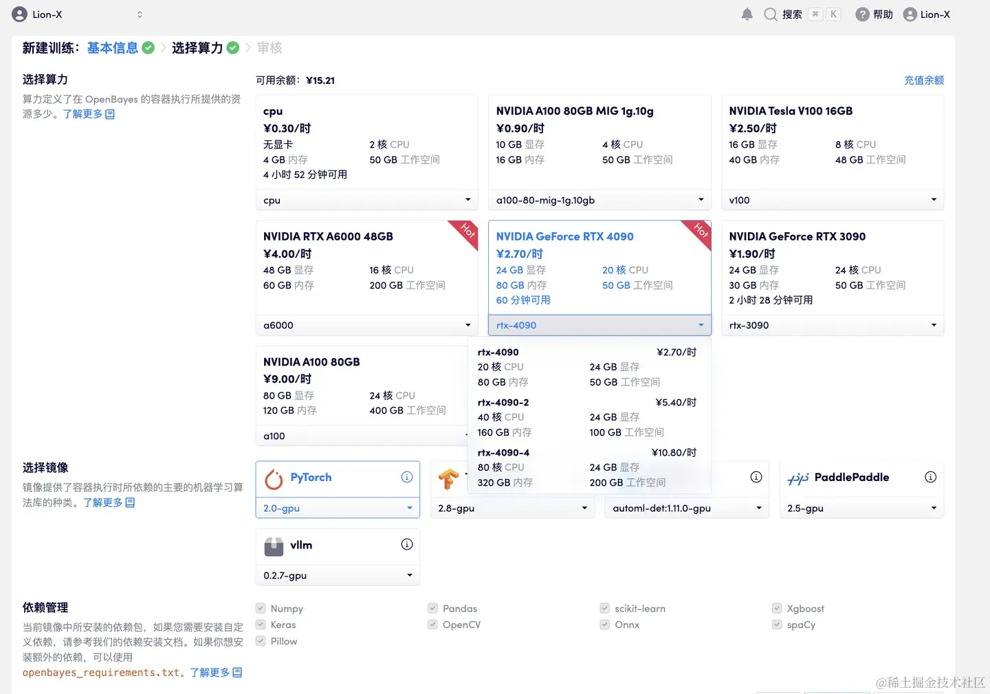 根据自身需求,选择相应的算力资源,可点击下拉箭头选择多卡算力资源。OpenBayes 平台会按照每种资源每小时的费用从用户的「余额」里开始扣费,每一个小时进行一次结算,不足一个小时会按照比例进行结算
