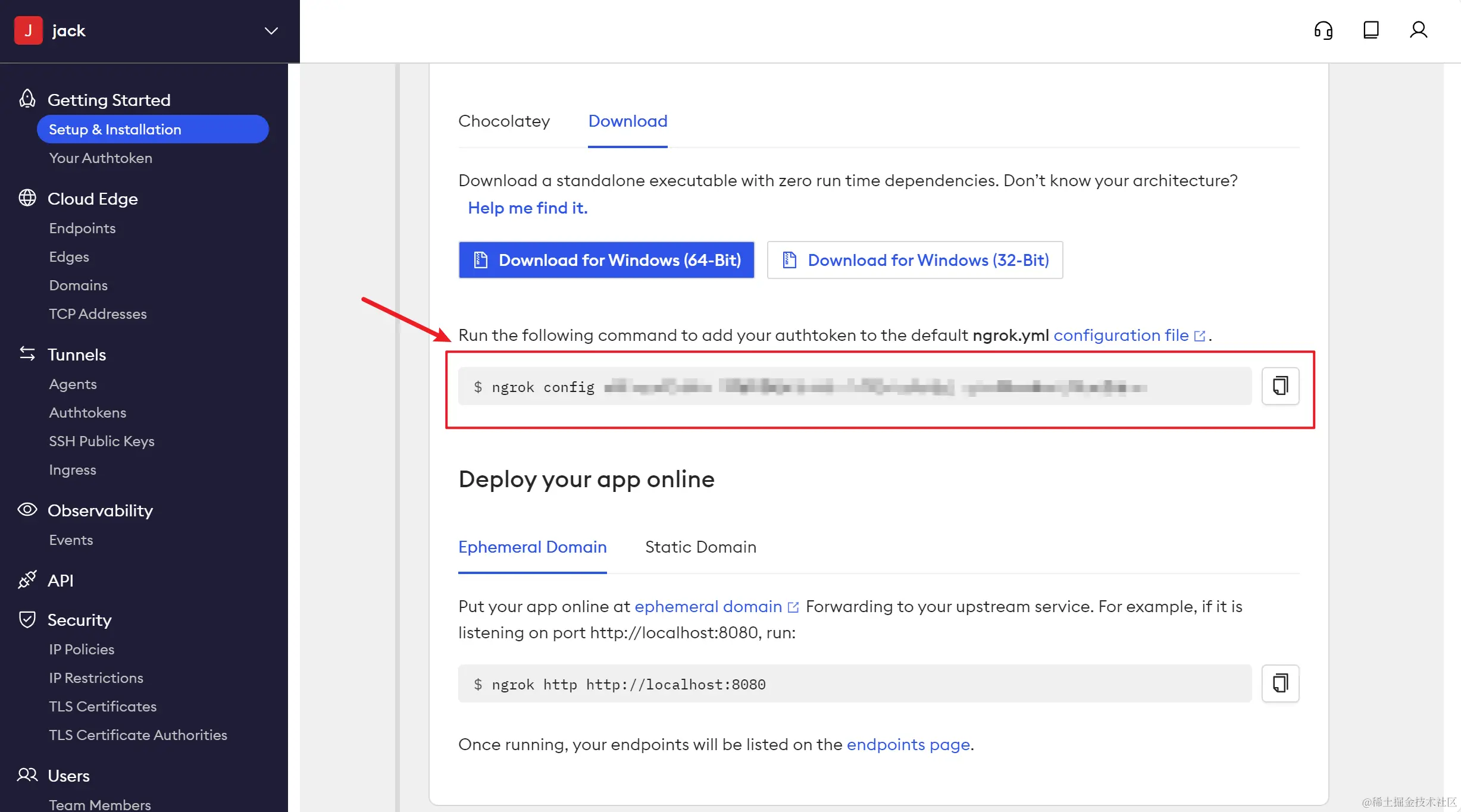 回到刚刚进行下载的页面,往下滑可以看到当前用户的身份验证令牌,复制这行命令