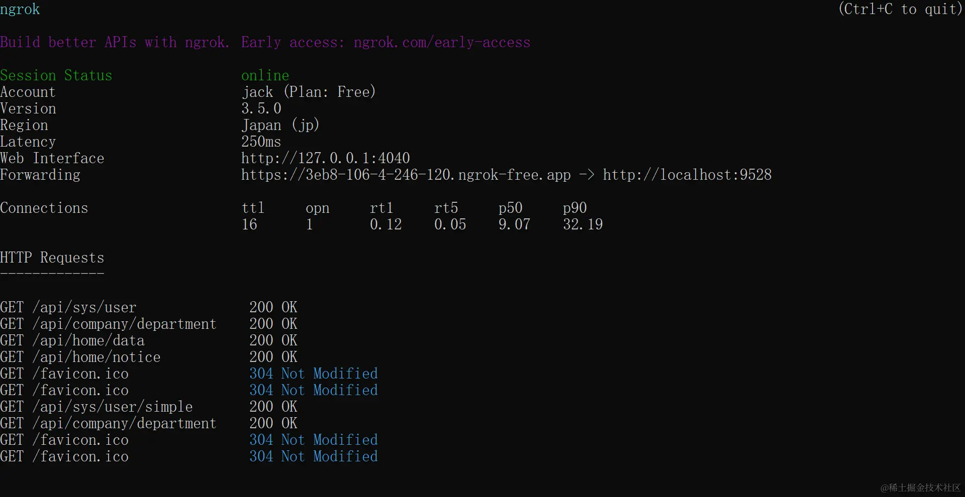 接下来只需要执行 ngrok http加项目端口号 就可以启动内网穿透服务啦
