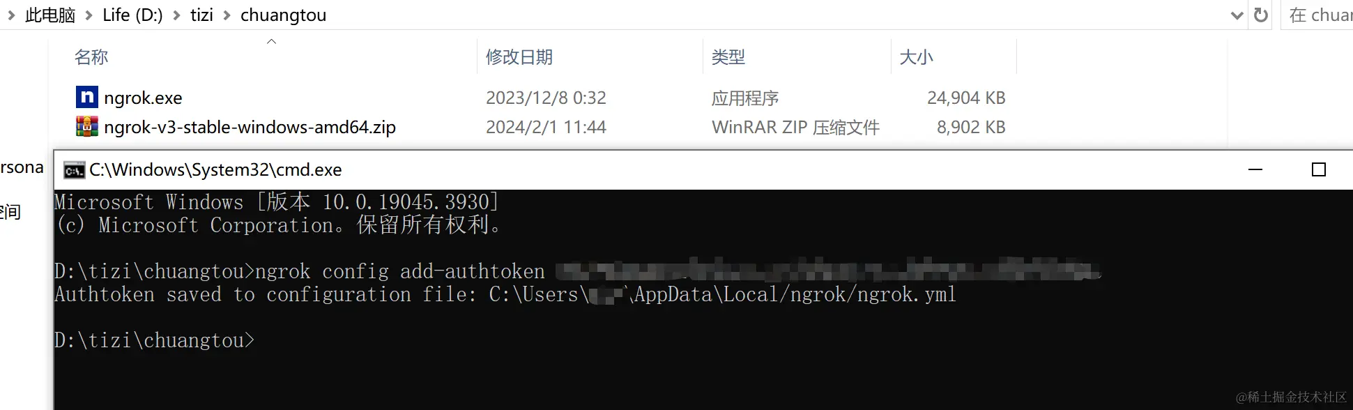 现在自己的账号信息已经成功保存到本地的ngrok配置文件了