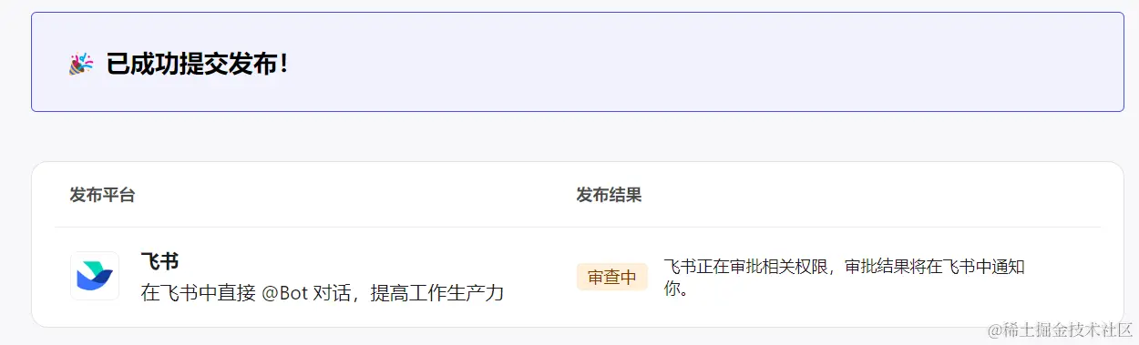 成功发布啦,等待飞书审核,就可以在飞书中使用啦。
