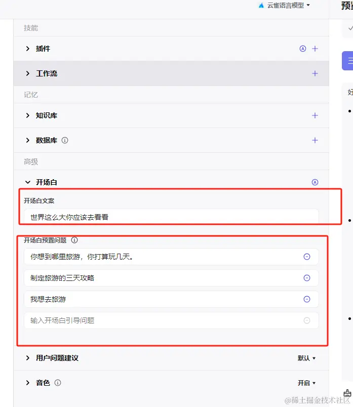 在中间部分你可以输入开场白和开场白的预置问题,这个根据你模型的需要自己设置即可。
