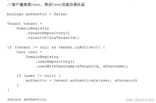我们来看看为什么领域服务在此时是必要的。我们可以简单地将认证操作放在实体上吗?从客户的角度来看,我们可能会使用以下代码来实现认证过程: