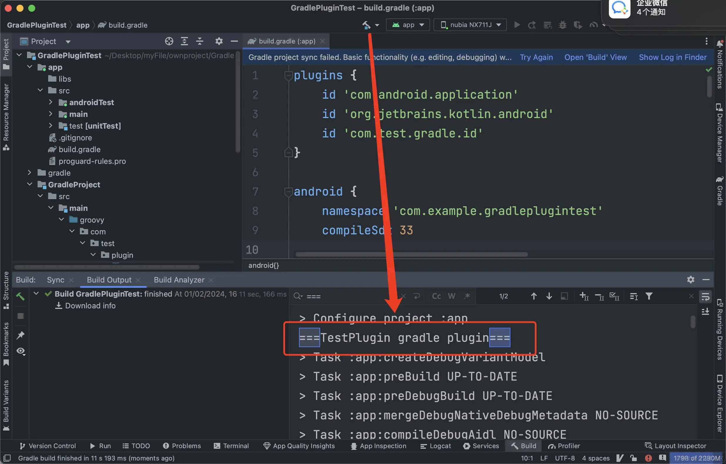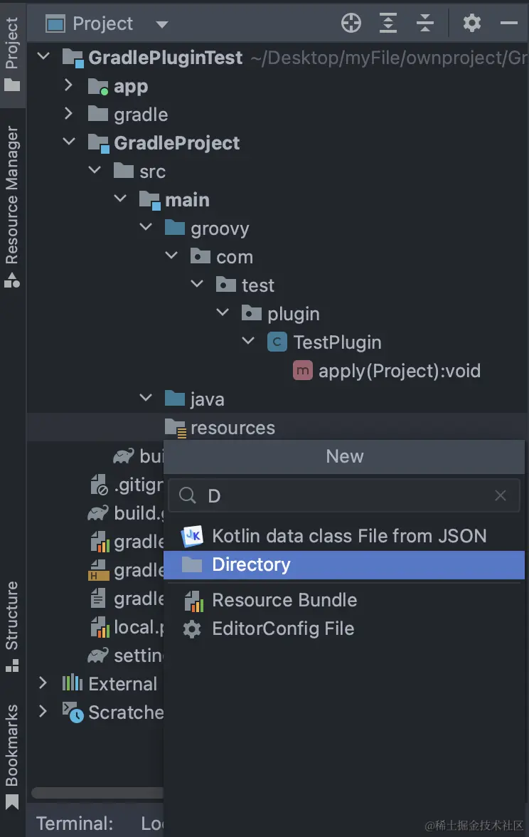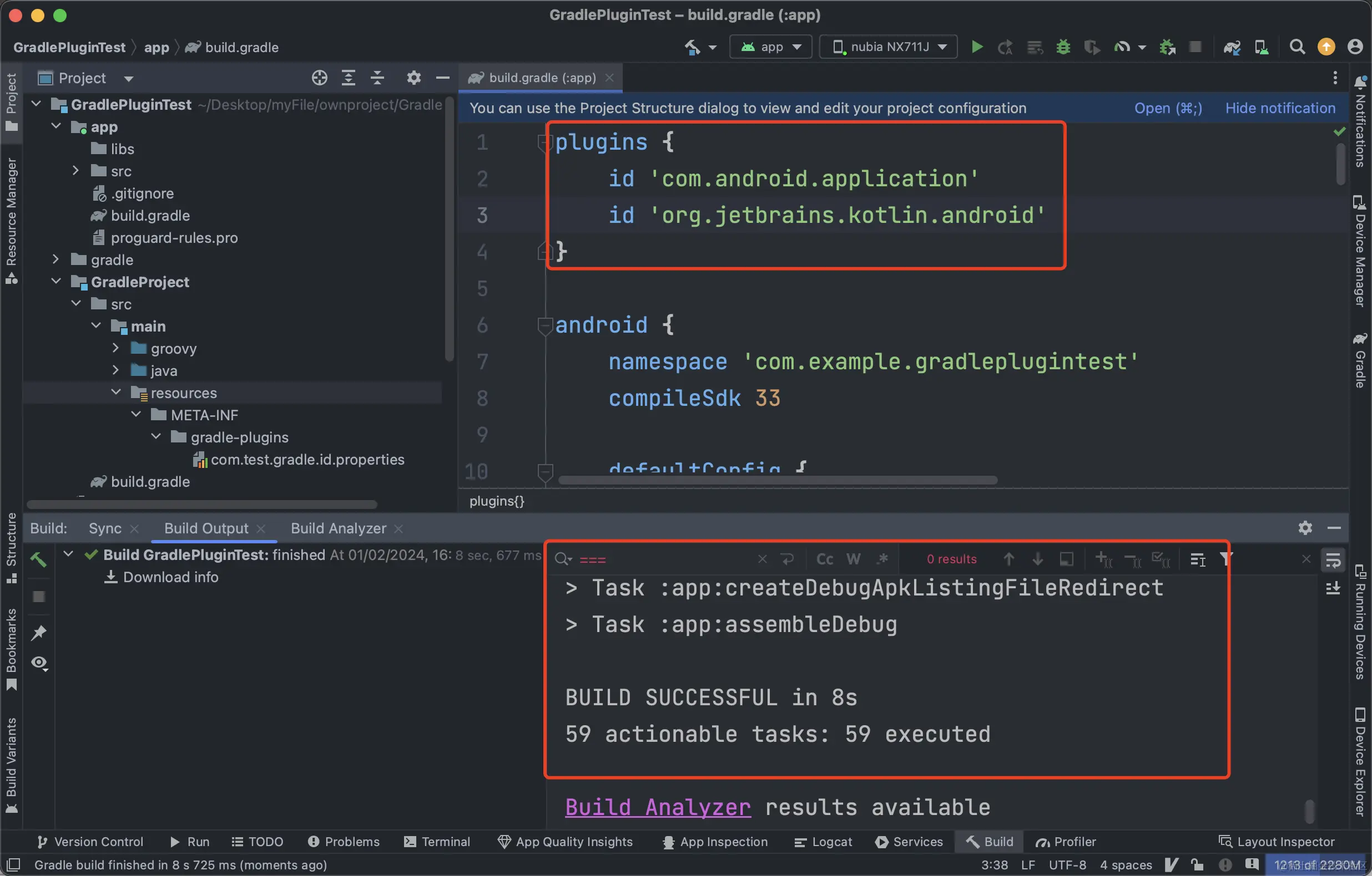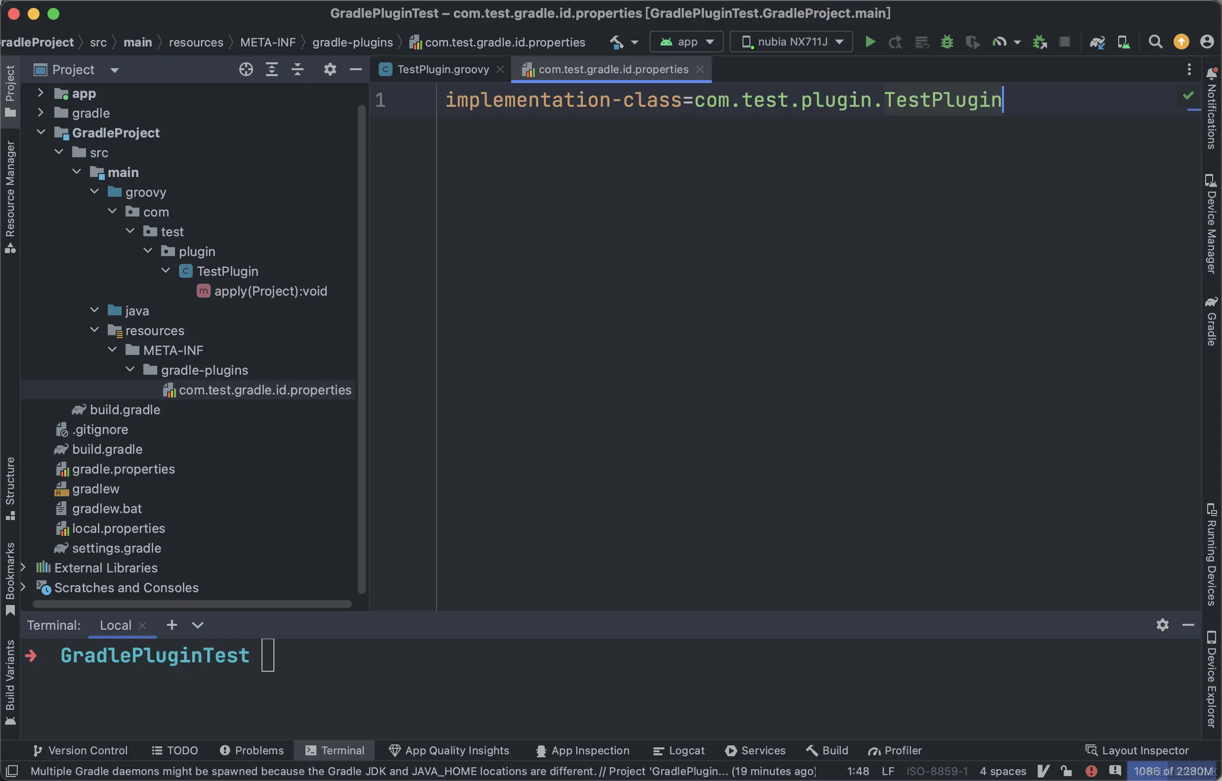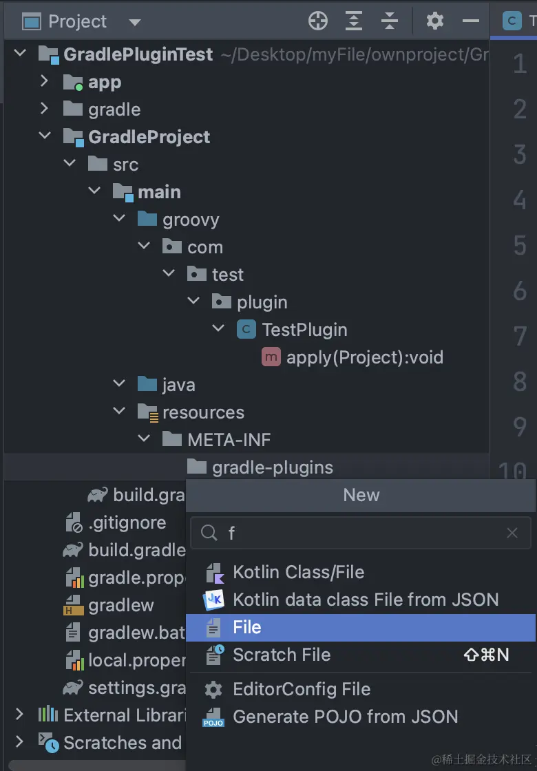 - 然后在'app'项目的build.gradle中添加如下引用代码, 此处plugins里面的 id 'com.test.gradle.id'就是前面提到的properties的文件名