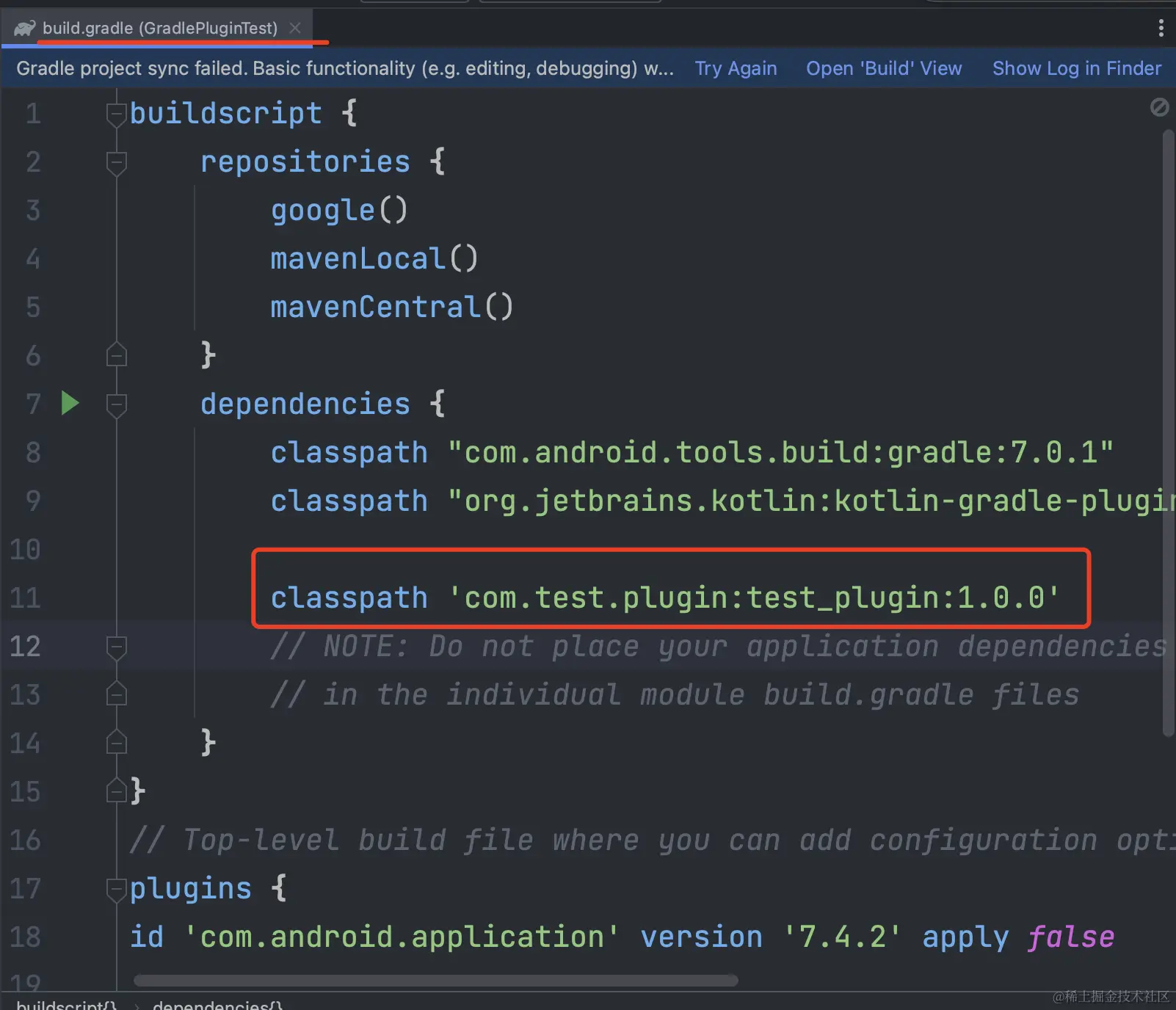 - 我们来引用一下自定义的插件,首先在工程的build.gradle文件中添加如下代码