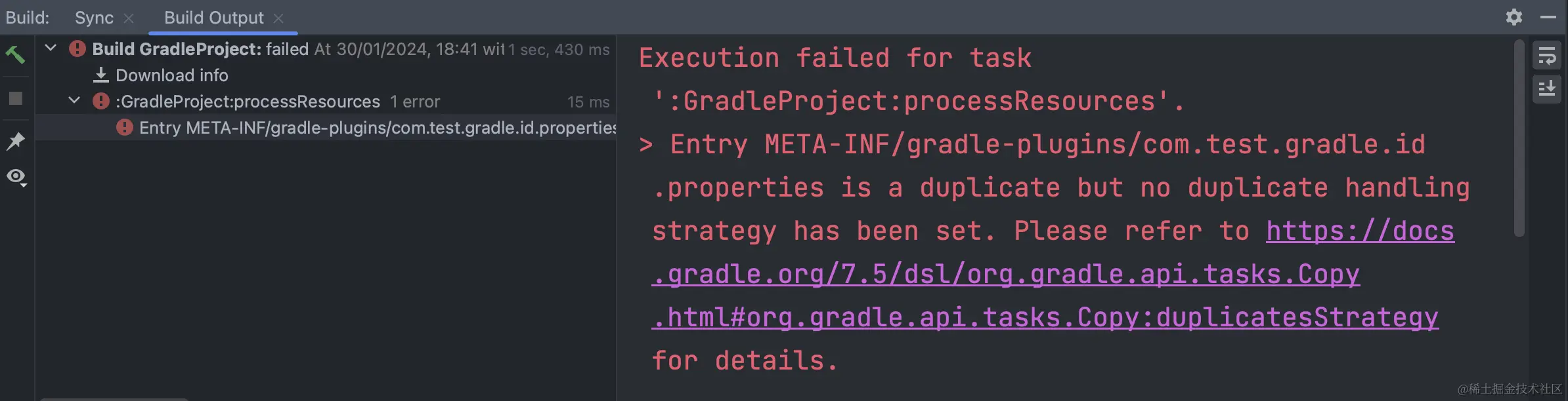 Entry META-INF/gradle-plugins/com.test.gradle.id.properties is a duplicate but no duplicate handling strategy has been set. Please refer to https://docs.gradle.org/7.5/dsl/org.gradle.api.tasks.Copy.html#org.gradle.api.tasks.Copy:duplicatesStrategy for details.