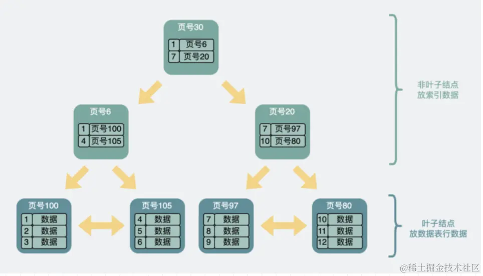 索引页就是存索引的节点,也就是非叶子节点。每一条索引记录当中都包含了当前索引的值 、 一个 6字节 的指针信息 、一个 5 字节的行标头,用来指向下一层数据页的指针。