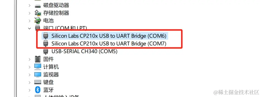 - 查看设备管理器,CP210x 设备已识别: