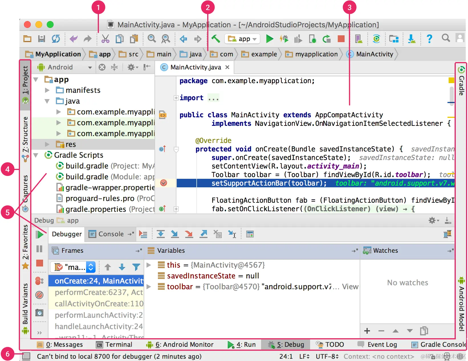 - 编辑器窗口:创建和修改代码。编辑器可能因当前文件类型而异。例如,查看布局文件时,该编辑器会显示布局编辑器。