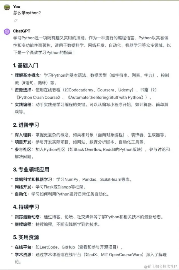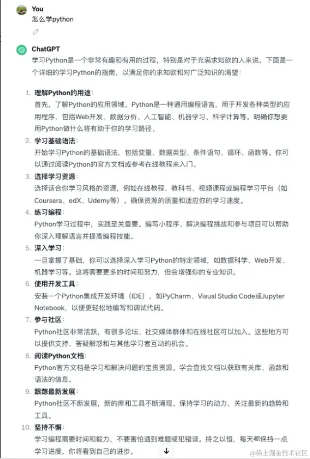 这里可以给大家举个例子:问大模型「怎么学习Python的?」