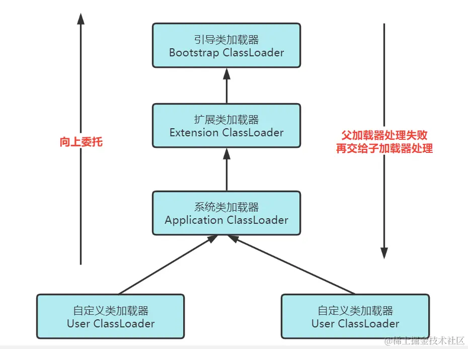 如果父加载器还存在父类加载器,则依次向上委托,因此类加载请求最终都应该被传递到顶层的启动类加载器中;