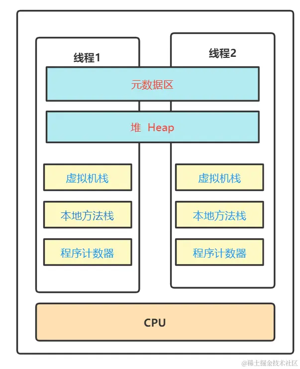 线程共享:元数据区、堆Heap;