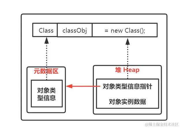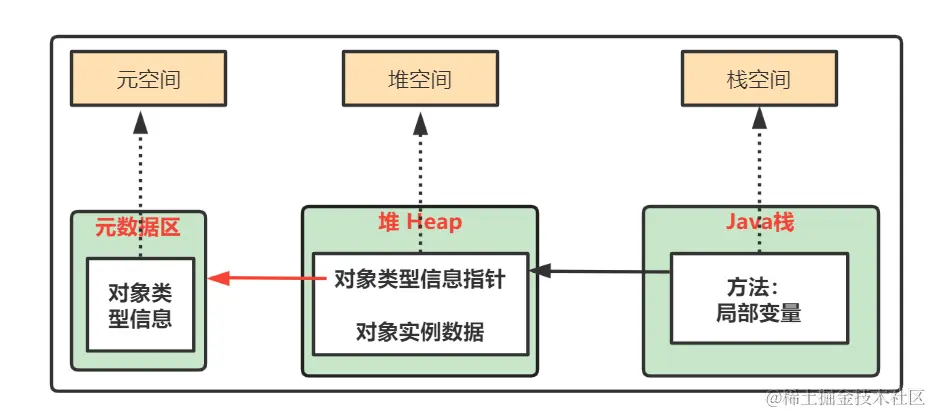 元空间存放加载的类信息,当类被实例化时,堆中存储实例化的对象信息,并且通过对象类型数据的指针找到类。