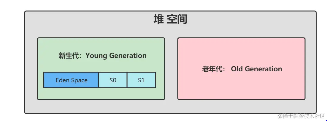 新生代:通常情况下,新创建的对象实例首先都是放在新生代空间中,所以追求快速的回收掉垃圾对象,一般情况下,新生代内存按照8:1:1的比例分为一个eden区和两个survivor(survivor0,survivor1)区,对象实例大部分在Eden区中生成;
