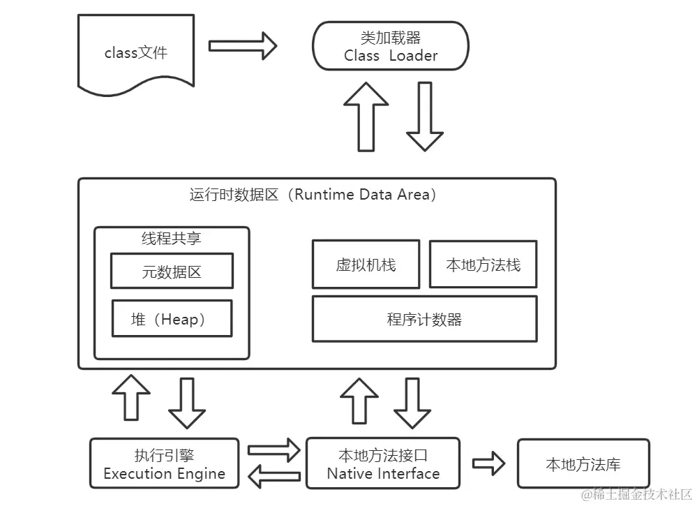 - 执行引擎:Java虚拟机最核心的组成部分,输入的是字节码,处理过程是字节码解析,输出执行结果