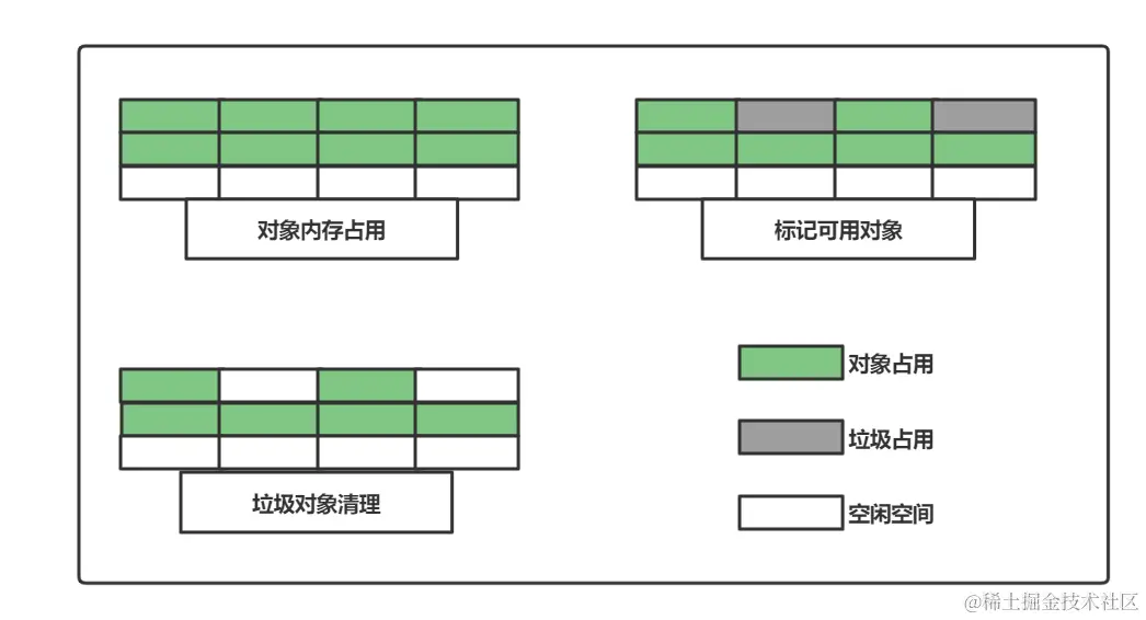 该算法效率不高,进行垃圾回收需要暂停应用程序,同时会产生大量内存碎片,后续程序运行过程中分配内存占用较大的对象时,会有连续内存不够情况,容易触发再一次垃圾收集动作。