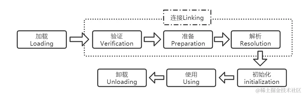 类在JVM中的生命周期为:加载,连接,初始化,使用,卸载。不过这里只重点描述加载,连接,初始化这三个过程