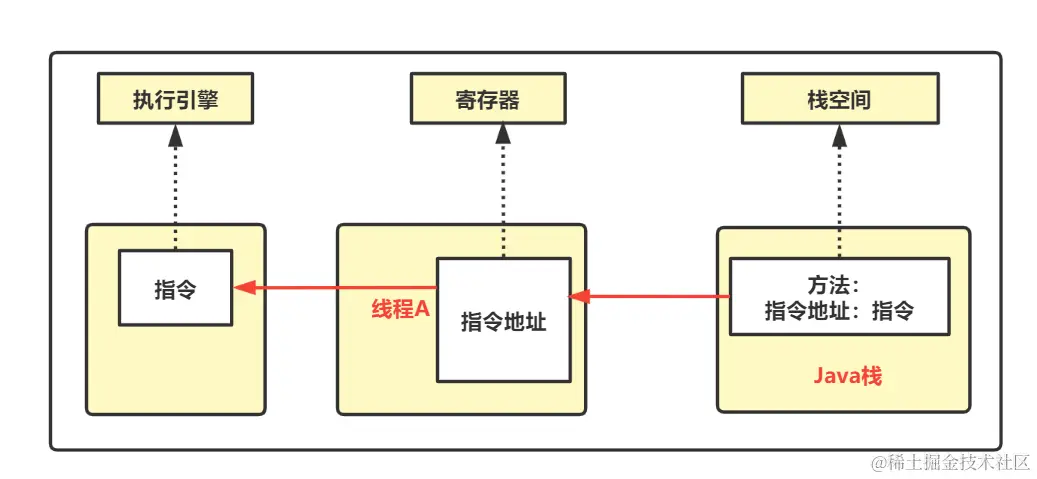 前后关系:线程在获取CPU的时间段内执行代码,但是线程随时可能没有执行完就被挂起,等到线程A再次获取CPU执行时,CPU 得知道执行到线程A的哪一个指令,程序计数器会存储该动作。