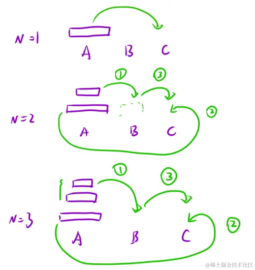 而汉诺塔的底层,其实也就是 塔 A 借助 塔 B ,转移到 塔 C 上而已,大家看下图理解一下: