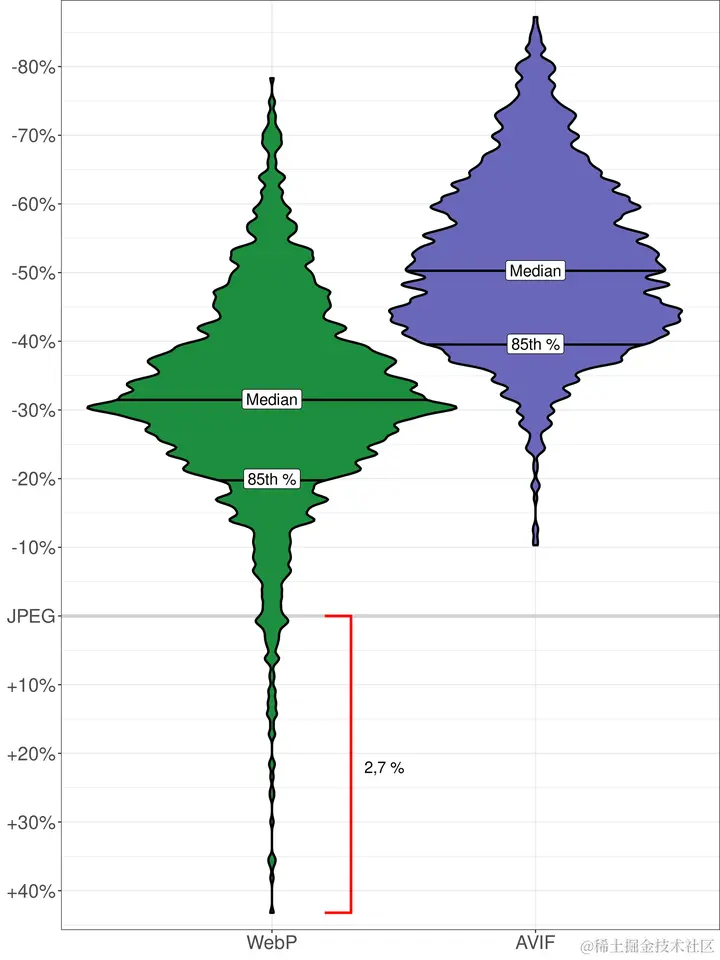 总体来看,AVIF全面领先,甚至是某些边界条件下,也表现较好。而WebP反而在极少数情况下,效果连JPEG都不如。(不过作者并没有给出此类条件的具体例子,这里尚不知原因)