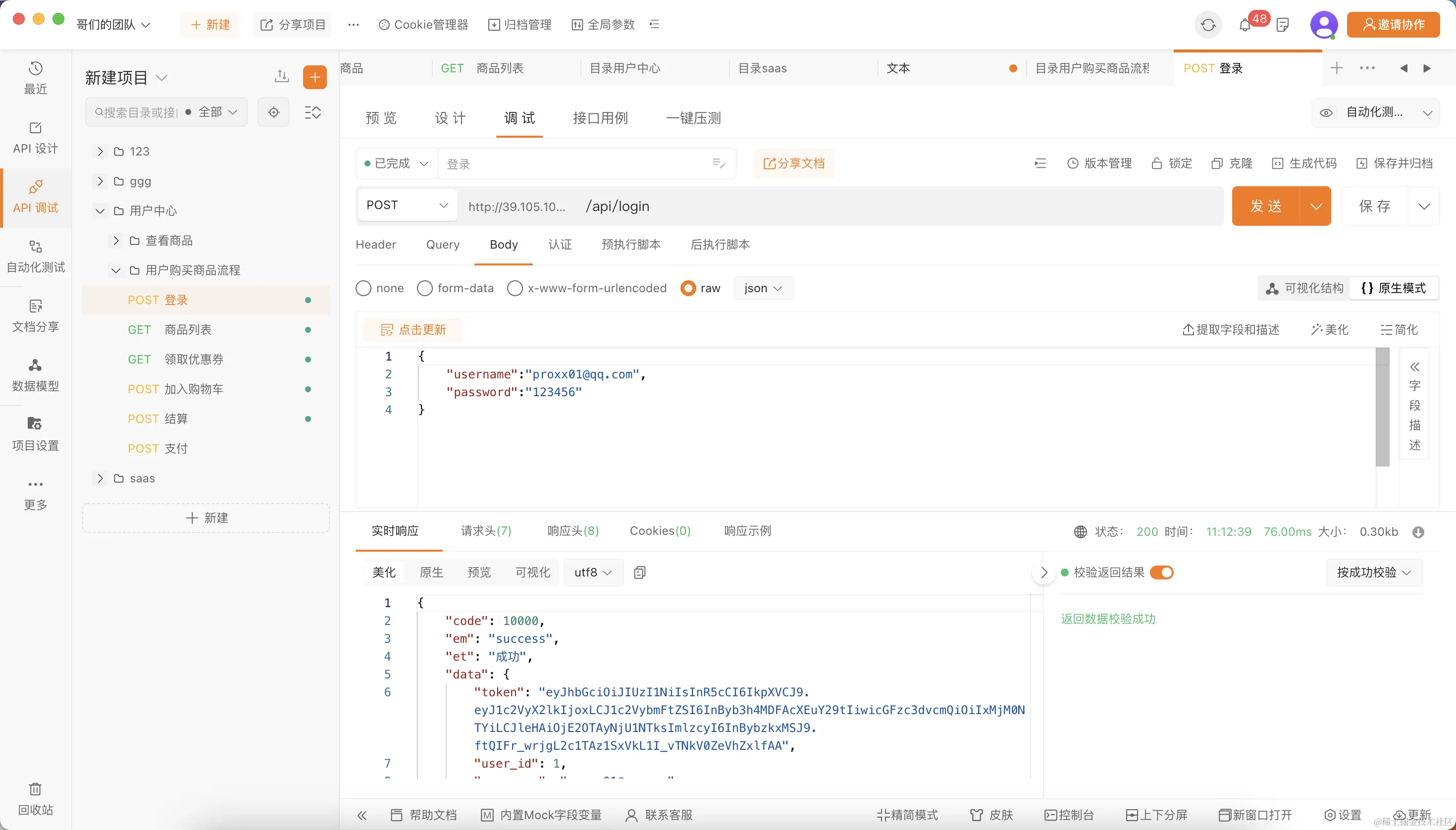 首先打开ApiPost界面点击新建,选择POST请求,输入url,请求参数选择json,输入对应的请求参数,点击发送,就可以请求成功啦