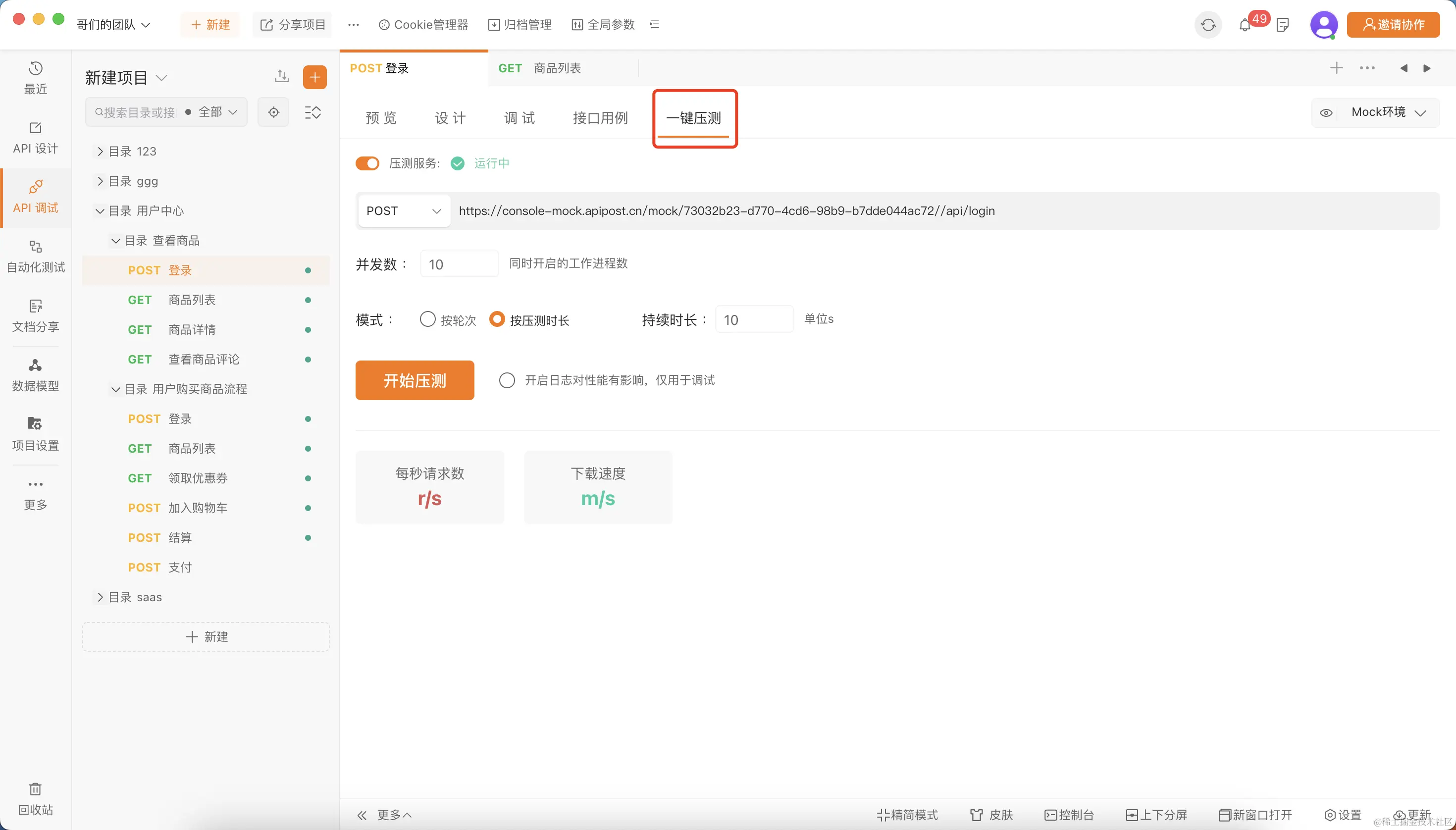 在Apipost中可以对接口进行并发测试,点击一键压测,输入并发数和时间/轮次,即可开始测试。