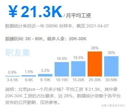从第三方平台统计的数据可以看到,Java工程师在2021年平均月薪超过21.3K,其中20K以上的薪资占比为54%。