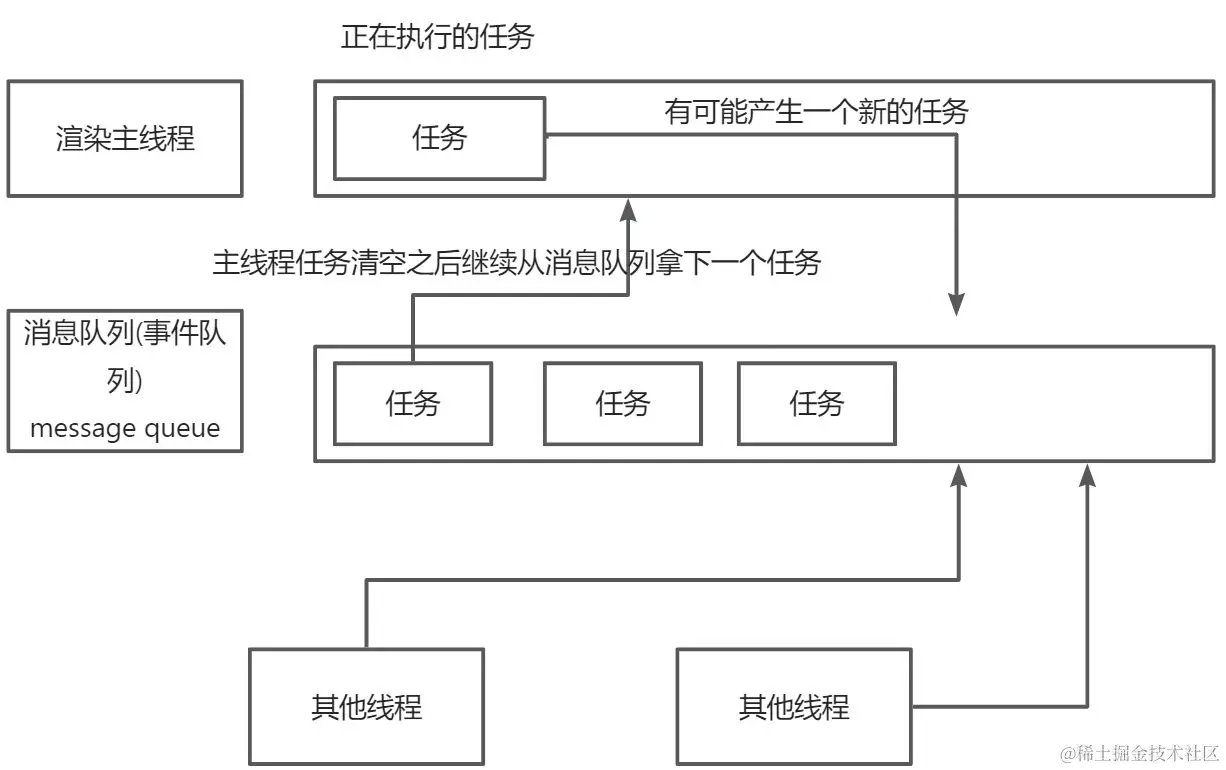 在 Chrome 的源码中,它开启一个不会结束的 for 循环,每次循环从消息队列中取出第一个任务执行,而其他线程只需要在合适的时候将任务加入到队列末尾即可。