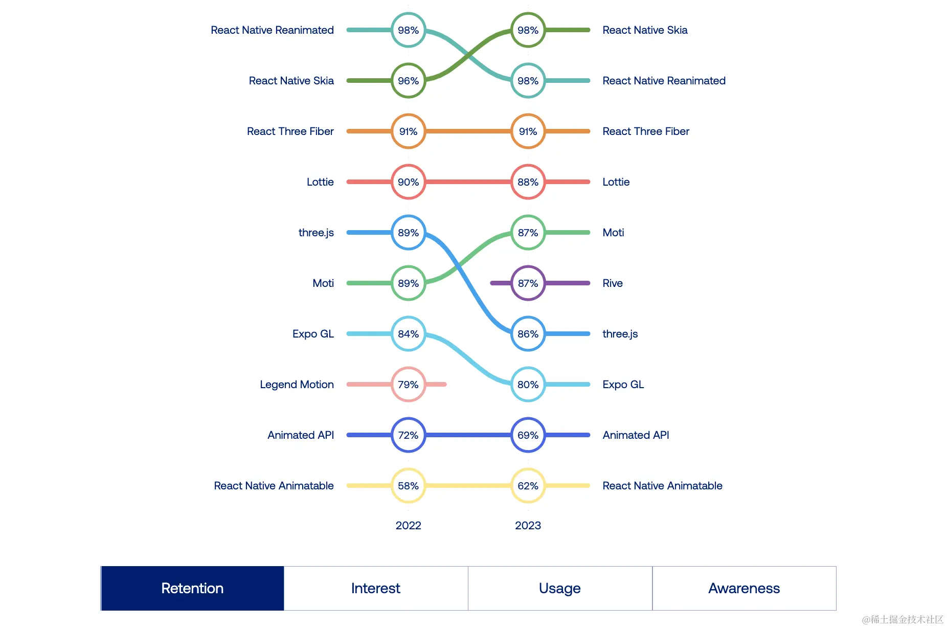 在去年的调查中,我预测了 Reanimated 和 Skia 的整合。这个联合如今已经结合在一起,并持续增长。我们开发的大多数新功能和改进都旨在与 Reanimated 最好地配合使用。