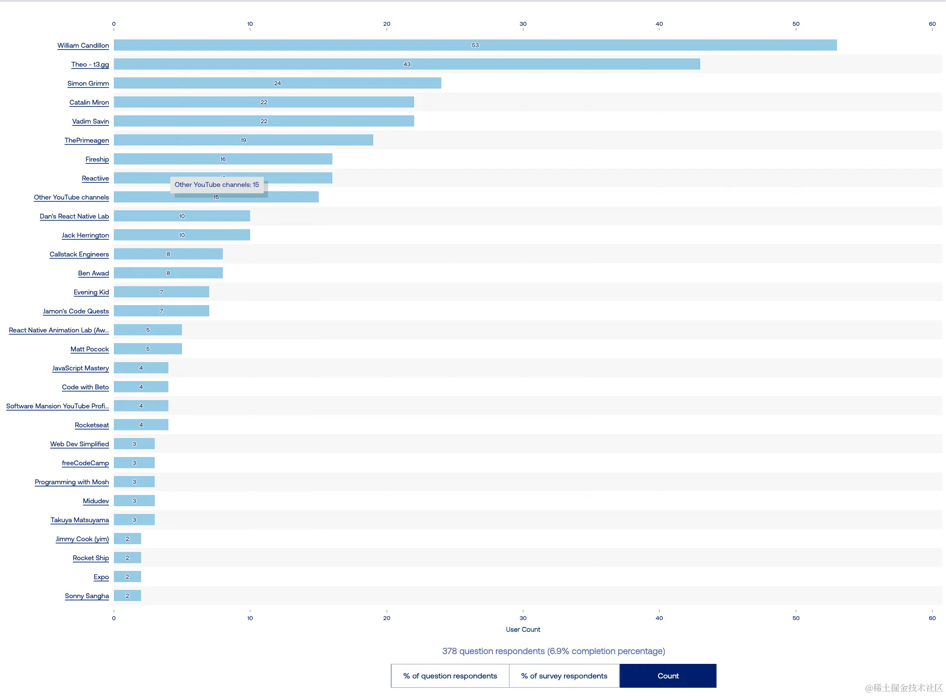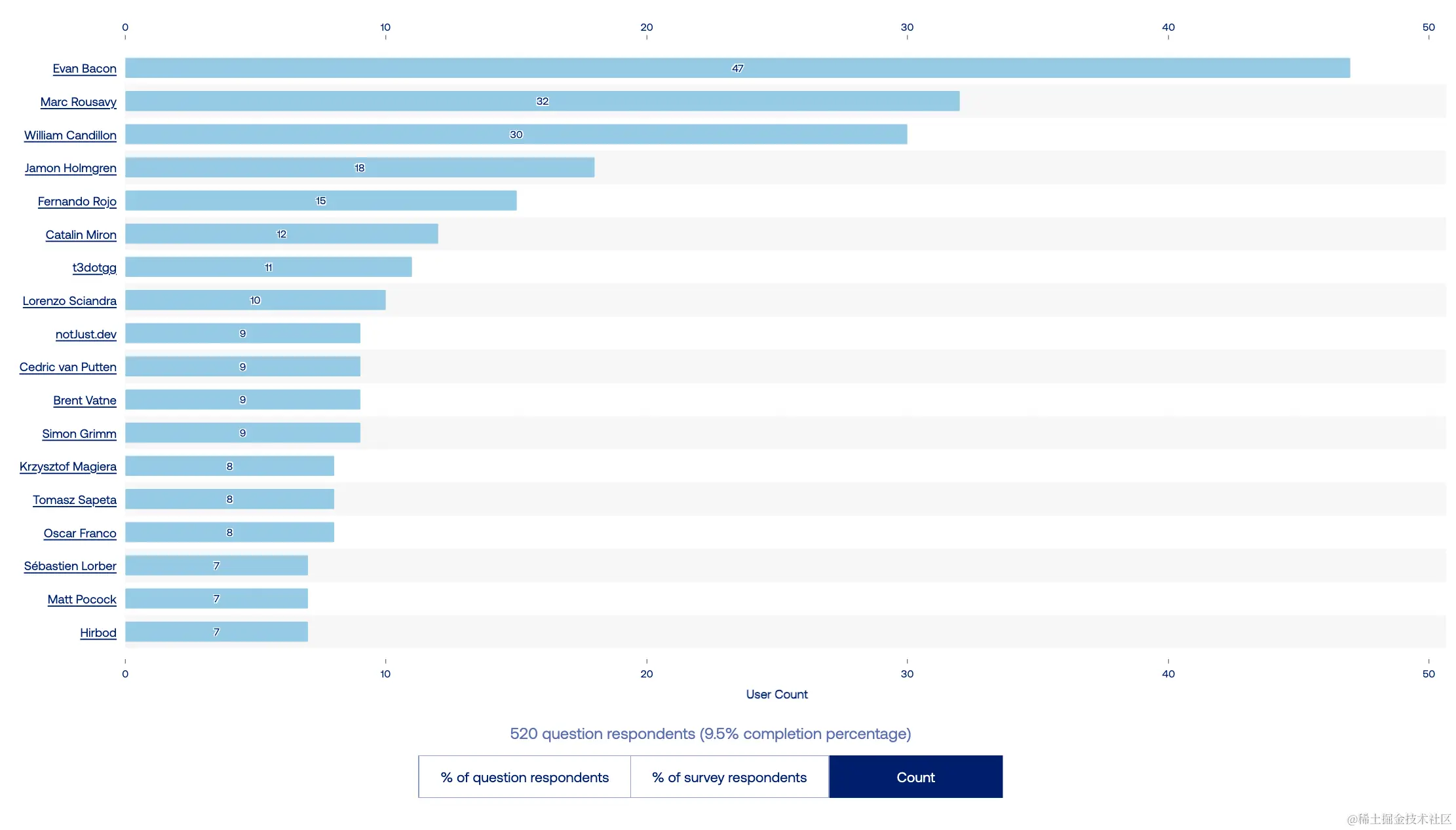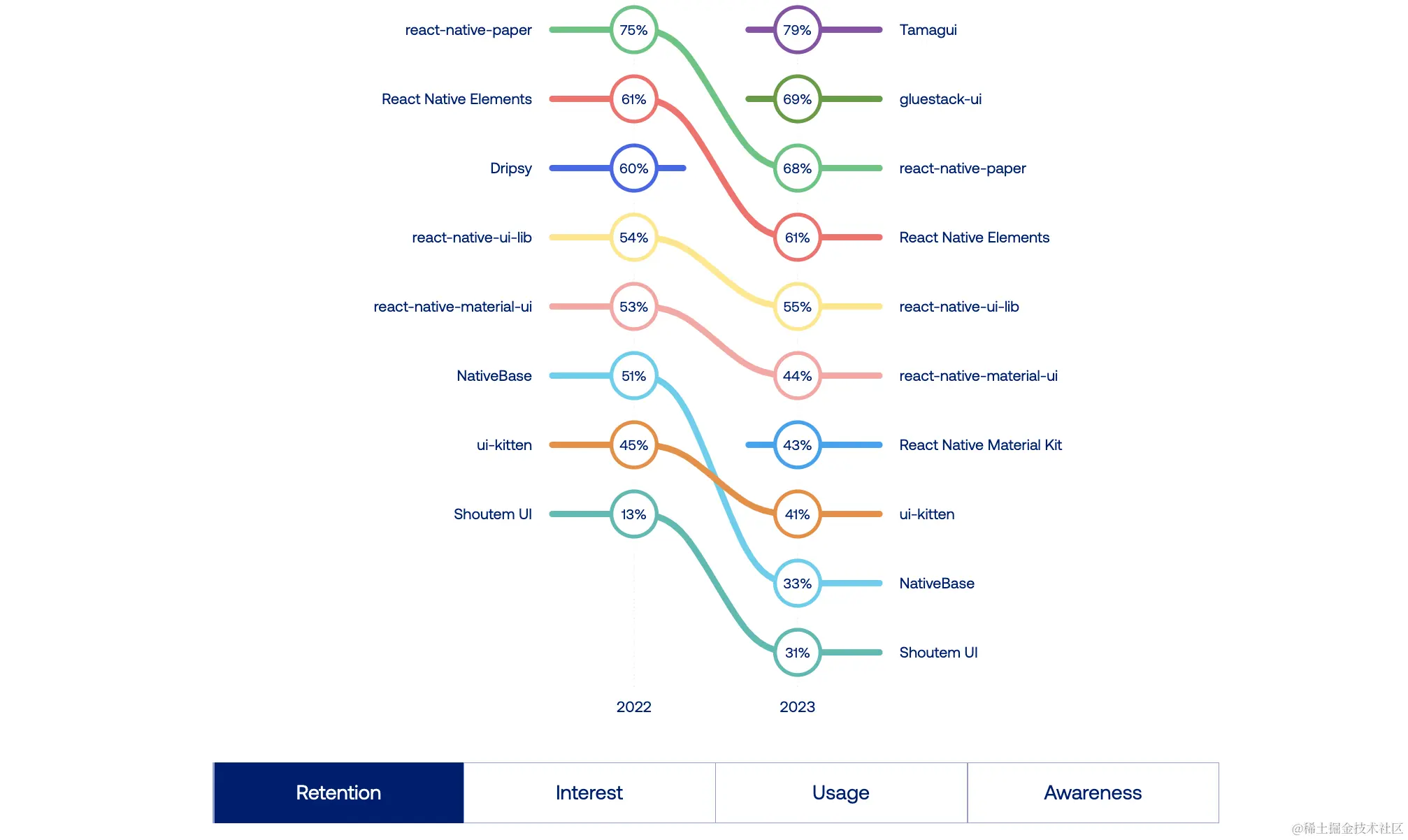 在领奖台下面,我们看到了一个新的参与者 —— Tamagui。它的受欢迎程度和使用率迅速增长。开发者们似乎真的很喜欢它!这很可能要归功于其人体工程学 API、优化编译器为 Web 生成最小量的 CSS、大量现成主题和其创建者显著的社区存在。