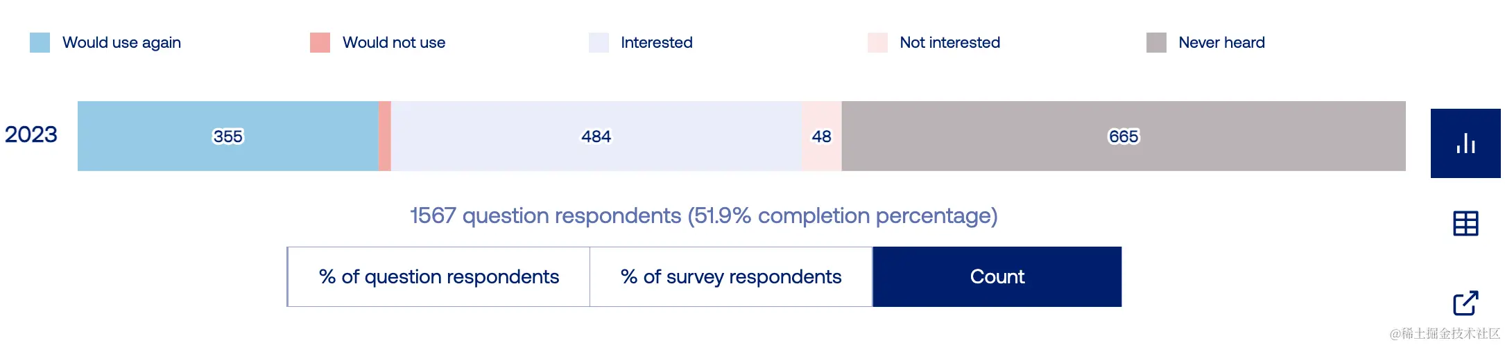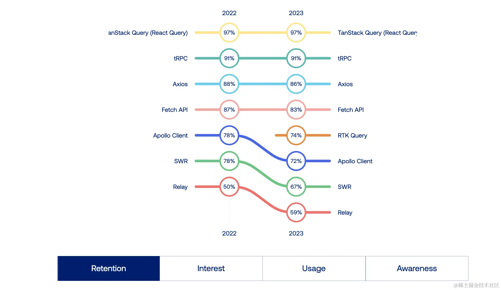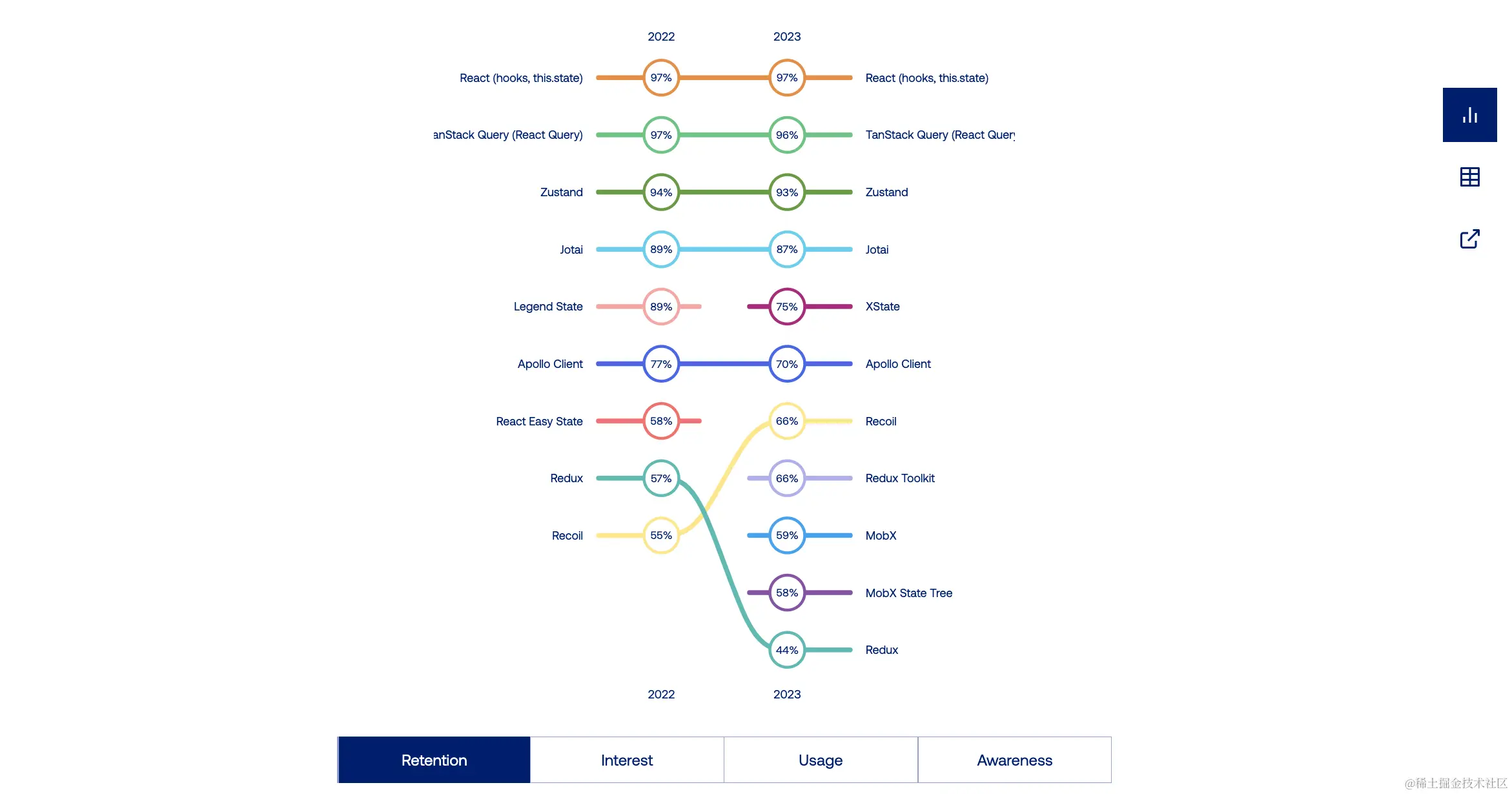 基于 Observable 的状态管理库,如 Jotai 和 MobX,继续拥有一个较小但充满激情的社区。这些库与基于选择器的库之间似乎存在着相当明显的分歧。 React Query 非常流行,它的活跃开发以及与其他状态管理库的兼容性使其在使用上具有优势——你不必在它和你喜欢的状态系统之间做出选择。你可以同时使用它们。 对于状态编排,XState 在兴趣(高)和使用(低)之间存在着最大的差距之一。我认为这归因于它的初始学习曲线和(必然的)冗长语法,以及与多年来建立起来的熟悉模式的偏离。然而,由于其可预测和全面的状态转换带来的显著优势,它仍然引起了大量的兴趣。 Apollo 仍然被广泛使用,但随着新的替代方案的出现,它的地位逐渐下降。它仍然是最强大的GraphQL中心状态系统。React Query 是 Apollo 的最常见替代方案,因为它更容易在不切换状态系统的情况下采用。 我的 MobX-State-Tree 继续保持着相当小众的地位,只有 13% 的使用率。值得注意的是,我们对文档和性能优化的投入将会在未来一年产生影响,这一点将会很有趣。