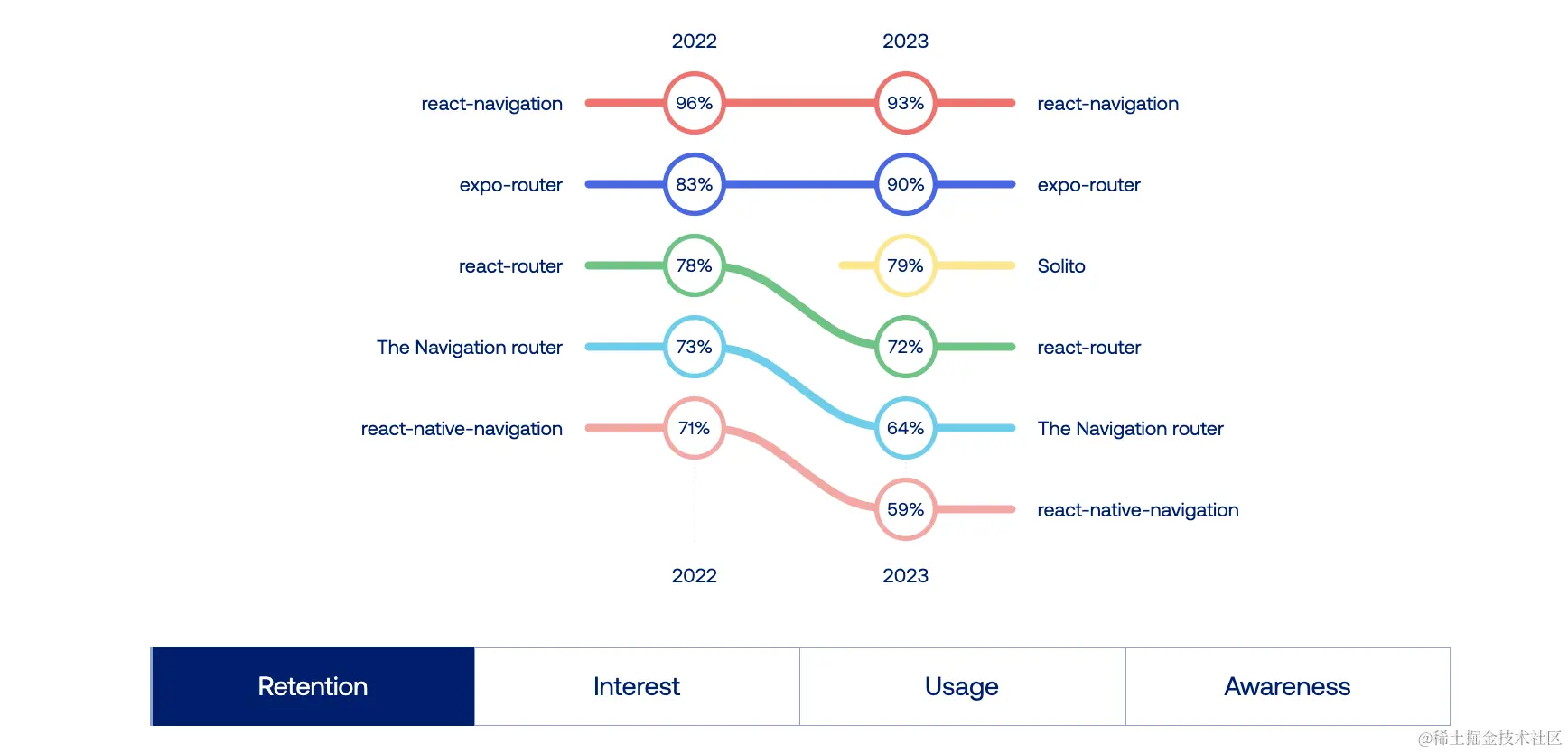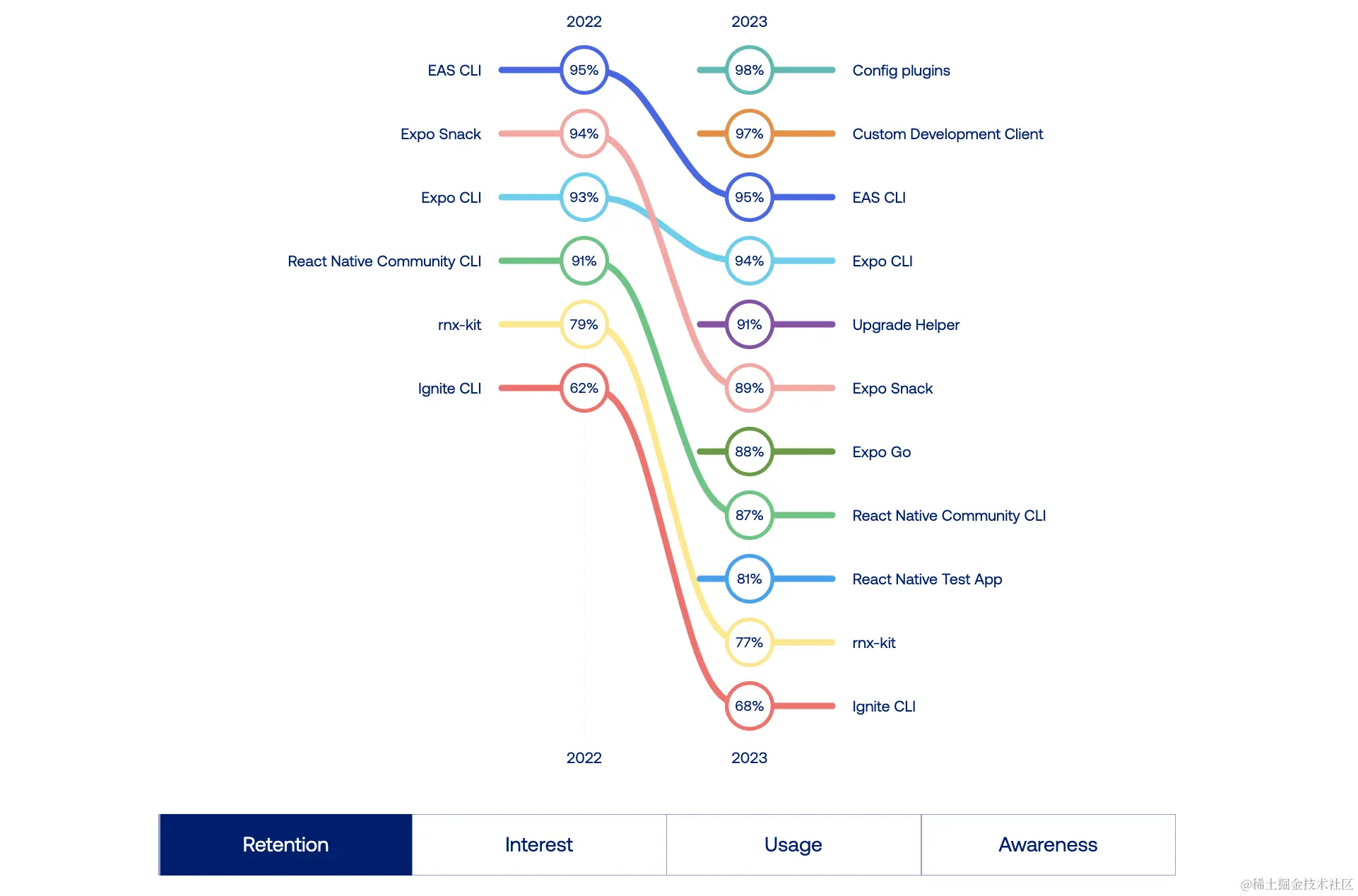 2023 年《React Native现状调查》的结果显示出明显的趋势:React Native 开发者越来越倾向于采用 Expo CLI、EAS CLI 和 Ignite CLI 作为其首选工具来开发项目。