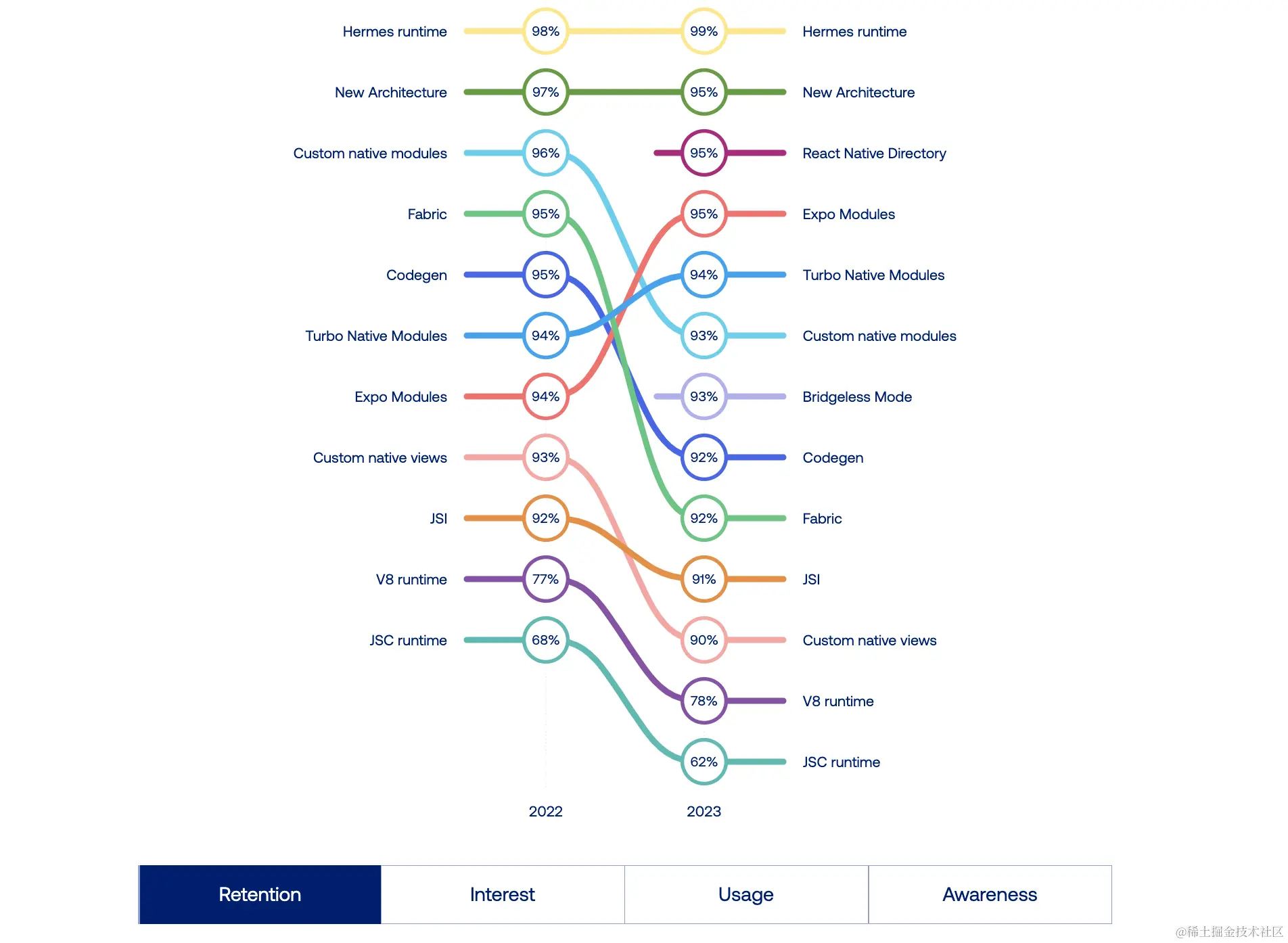 特定功能的数据不仅反映了当前的情况,还塑造了 React Native 演进的轨迹。像代码生成、无桥接和全新架构等技术的指标真正强调了社区对创新和效率的承诺。特别值得注意的是对这些功能的积极情绪,这反映了社区的热情,并与提升开发者体验和性能的更广泛目标一致;即使在我们自己的 Microsoft 项目中,React Native Test App,我们已经在努力添加无桥接支持。