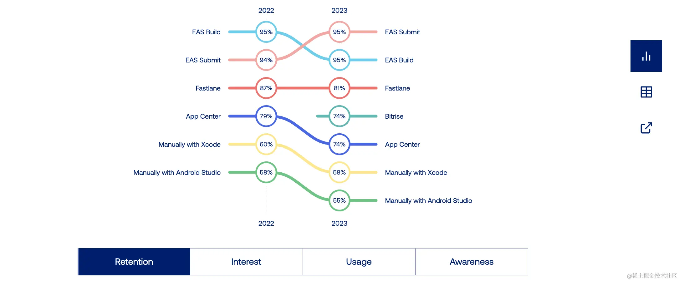2023 年的 React Native 现状调查结果显示了一个普遍的趋势:React Native 开发人员越来越倾向于使用自动化构建和部署工具来处理他们应用的构建和发布。与此同时,他们对使用 Xcode 和 Android Studio 的手动构建和分发流程的兴趣似乎在减弱。