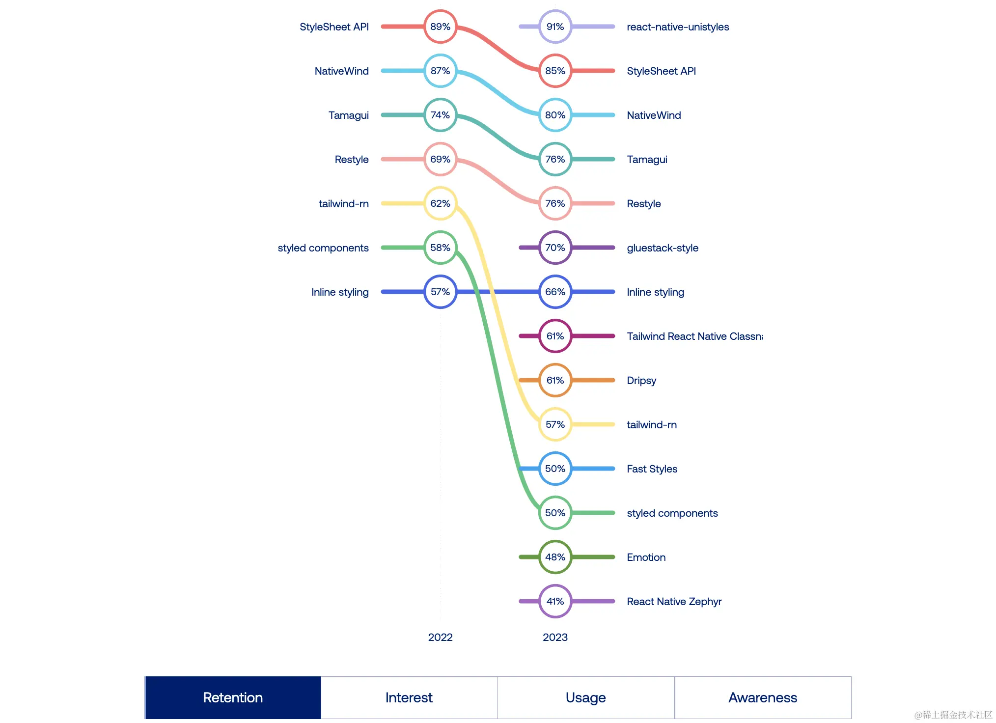 StyleSheet 仍然是最广泛使用的解决方案,但也有一些新兴的明星。Tamagui 的用户数量增长了三倍,而 NativeWind 正在日益受到欢迎,因为我们喜欢使用 Tailwind 来为跨平台应用程序添加样式。在这里,我们观察到一个有趣的趋势:一些开发者终于开始摆脱 StyleSheet,并找到了他们新的首选解决方案。