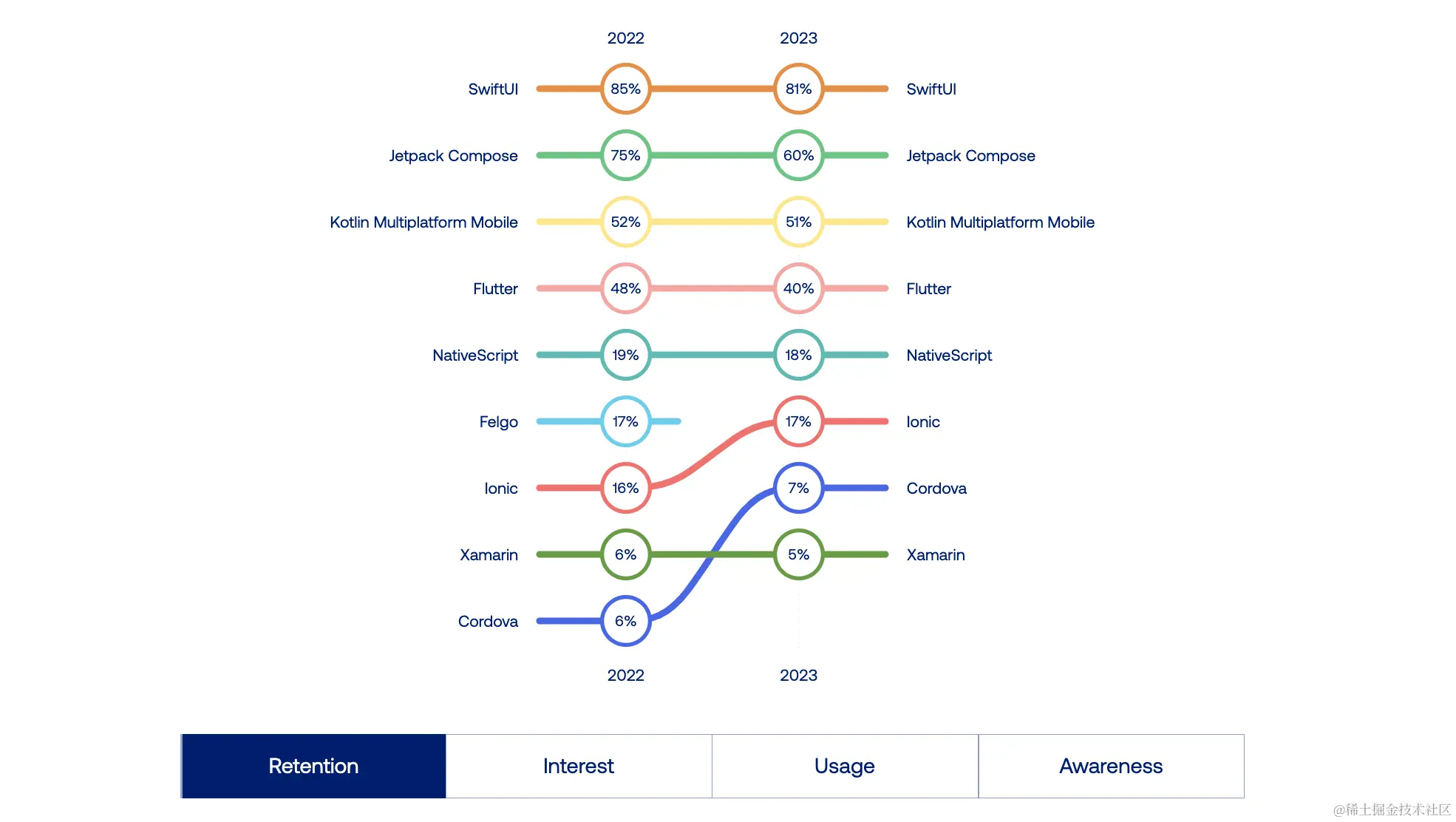 开发者们逐渐对传统的基于 Web 的跨平台框架替代方案,如 Cordova 或 Ionic,失去了兴趣。