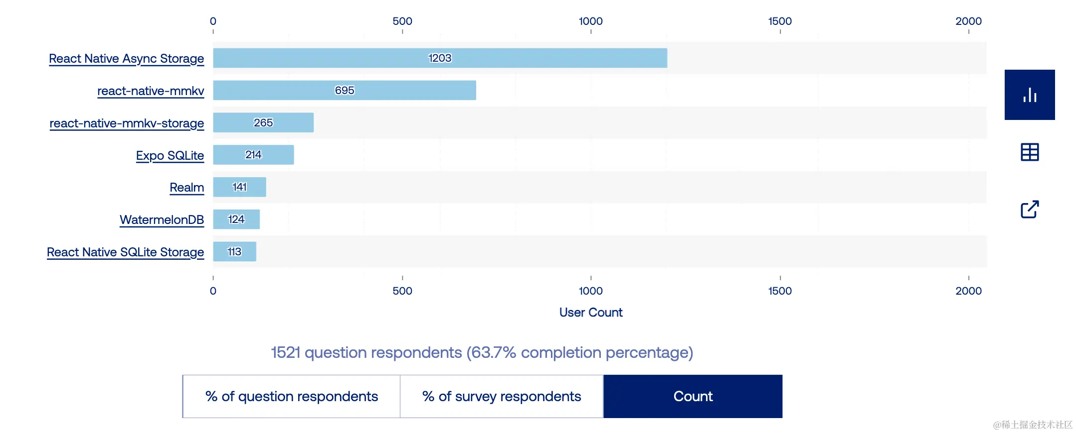 Redux 在 React Native 中的状态管理领域的地位已经逐渐下滑了多年。Redux Toolkit 的出现为该项目注入了新的活力,令人印象深刻的是它已经达到了 62% 的使用率。