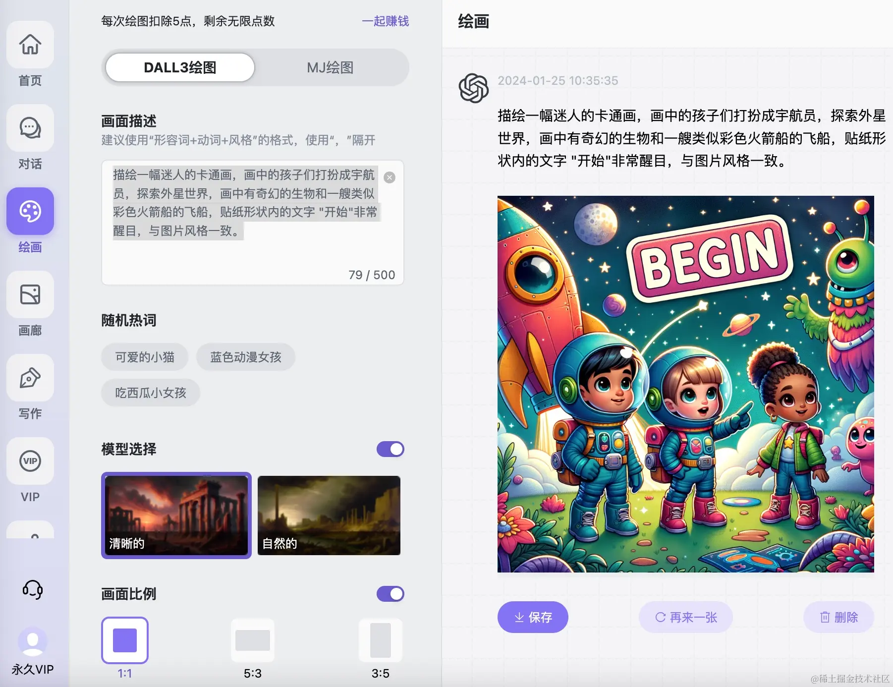 - 贴纸风格:[图像提示词],贴纸形状内的文字"[文字]"非常醒目,并与图像样式保持一致。 eg:描绘一幅迷人的卡通画,画中的孩子们打扮成宇航员,探索外星世界,画中有奇幻的生物和一艘类似彩色火箭船的飞船,贴纸形状内的文字 "开始"非常醒目,与图片风格一致。