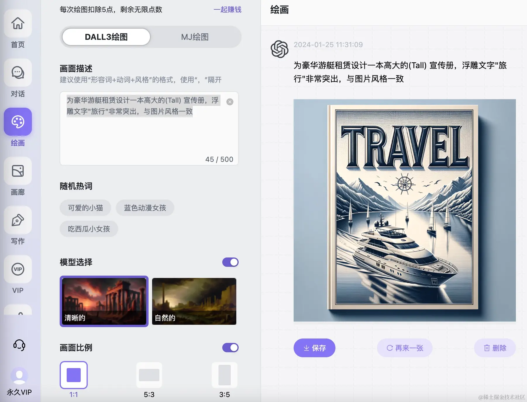 - 浮雕效果:[图像提示词],浮雕文字"[文字]"效果突出,与图像风格一致。 eg:为豪华游艇租赁设计一本高大的(Tall)宣传册,浮雕文字"旅行"非常突出,与图片风格一致。