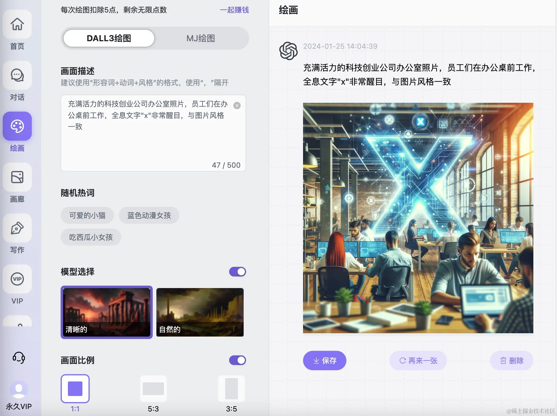 - 全息文字:[图像提示词],全息文字"[文字]"非常醒目,并与图像风格保持一致。 eg:充满活力的科技创业公司办公室照片,员工们在办公桌前工作,全息文字"x"非常醒目,与图片风格一致。